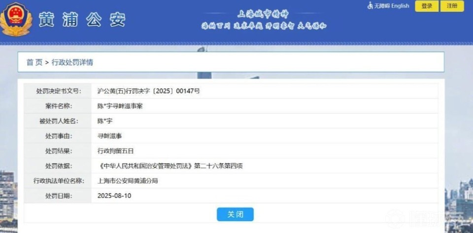 北京时间8月12日,上海黄浦公安公布了最新的行政处罚,陈某宇因寻衅滋事被处以行政拘留五日的处罚,原因疑似是别停上海海港的大巴车。