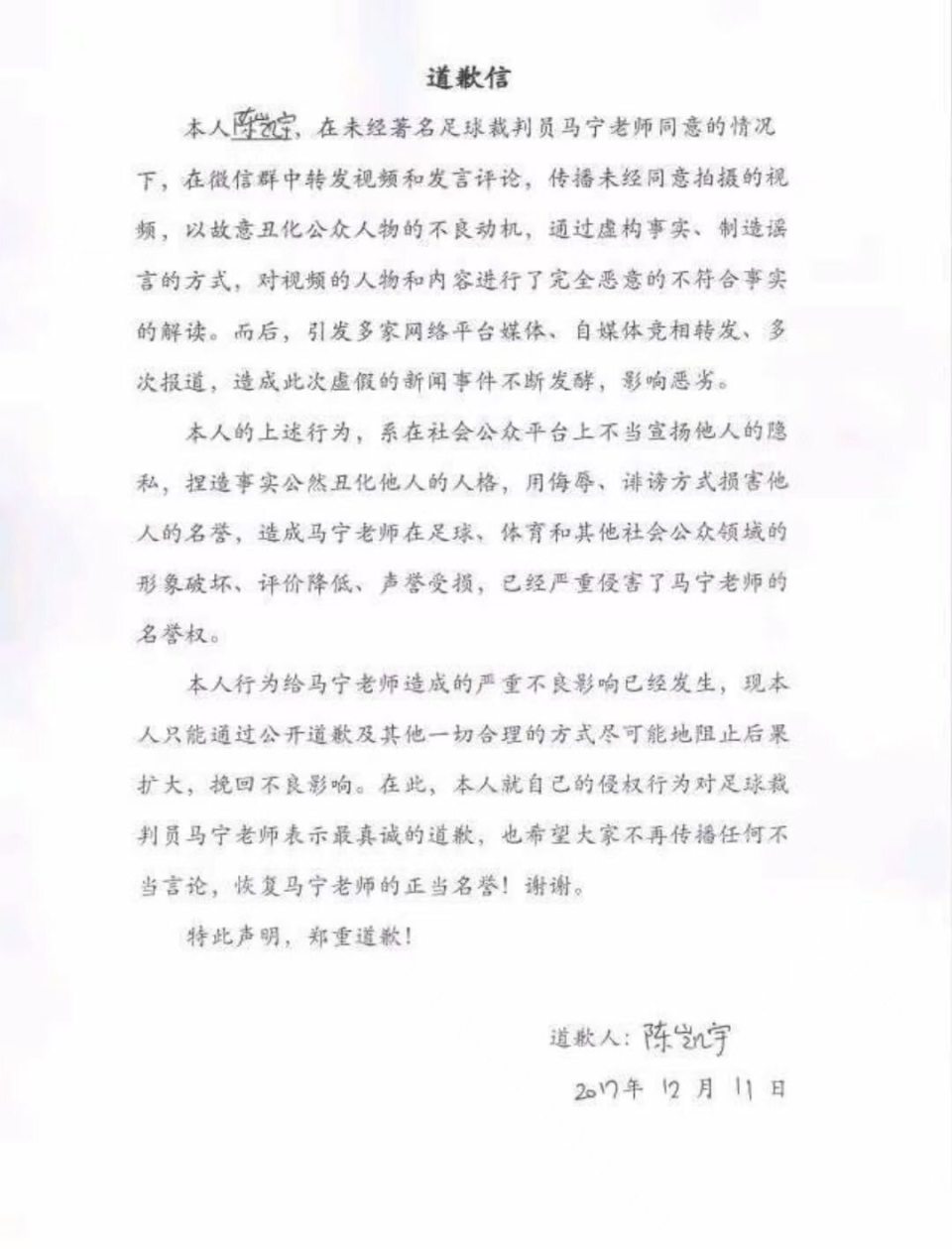 而有网友发现,陈某宇的名字与2017年造谣中超名哨马宁的陈凯宇名字高度相似。当年12月,陈凯宇承认对马宁侮辱、诽谤,造成马宁的形象破坏、评价降低、声誉受损,并公开道歉。